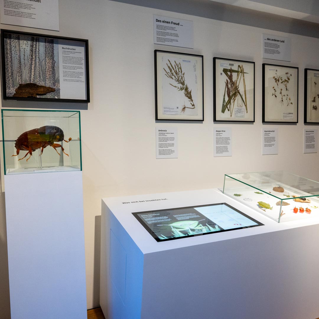 Ausstellungsgestaltung, Konzept, Text, Grafik, Video, Modellbau (Borkenkäfer)