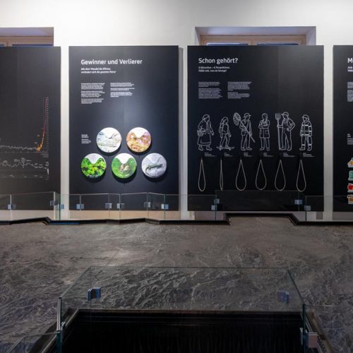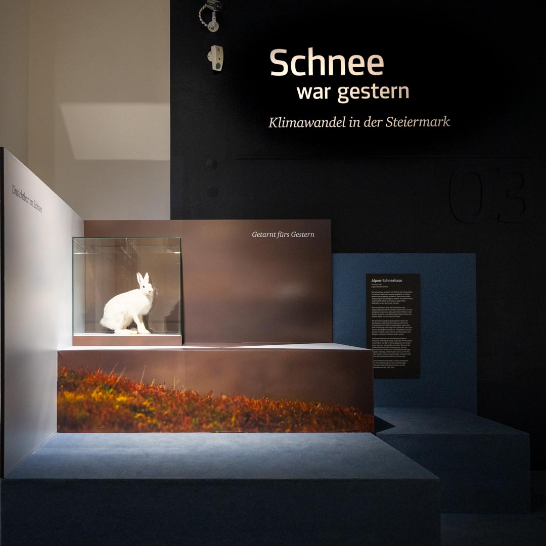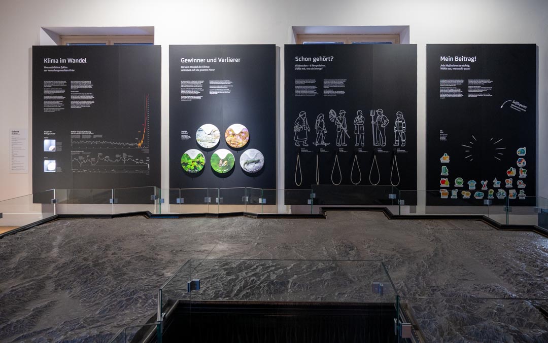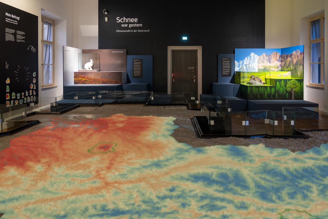 Aktuelle Klimadaten werden zusätzlich auf ein historisches Relief der Steiermark projiziert und durch einen eigens produzierten 12-minütigen Film ergänzt.
