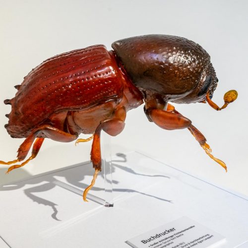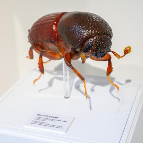 Ergänzt werden diese Szenen durch ein wissenschaftlich korrektes Borkenkäfer-Großmodell im Maßstab 50:1 der von uns eigens für diese Ausstellung modelliert wurde.