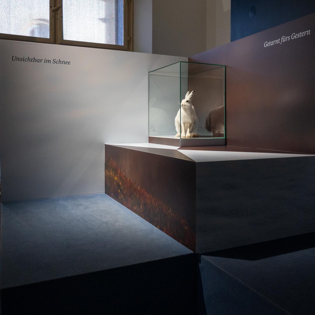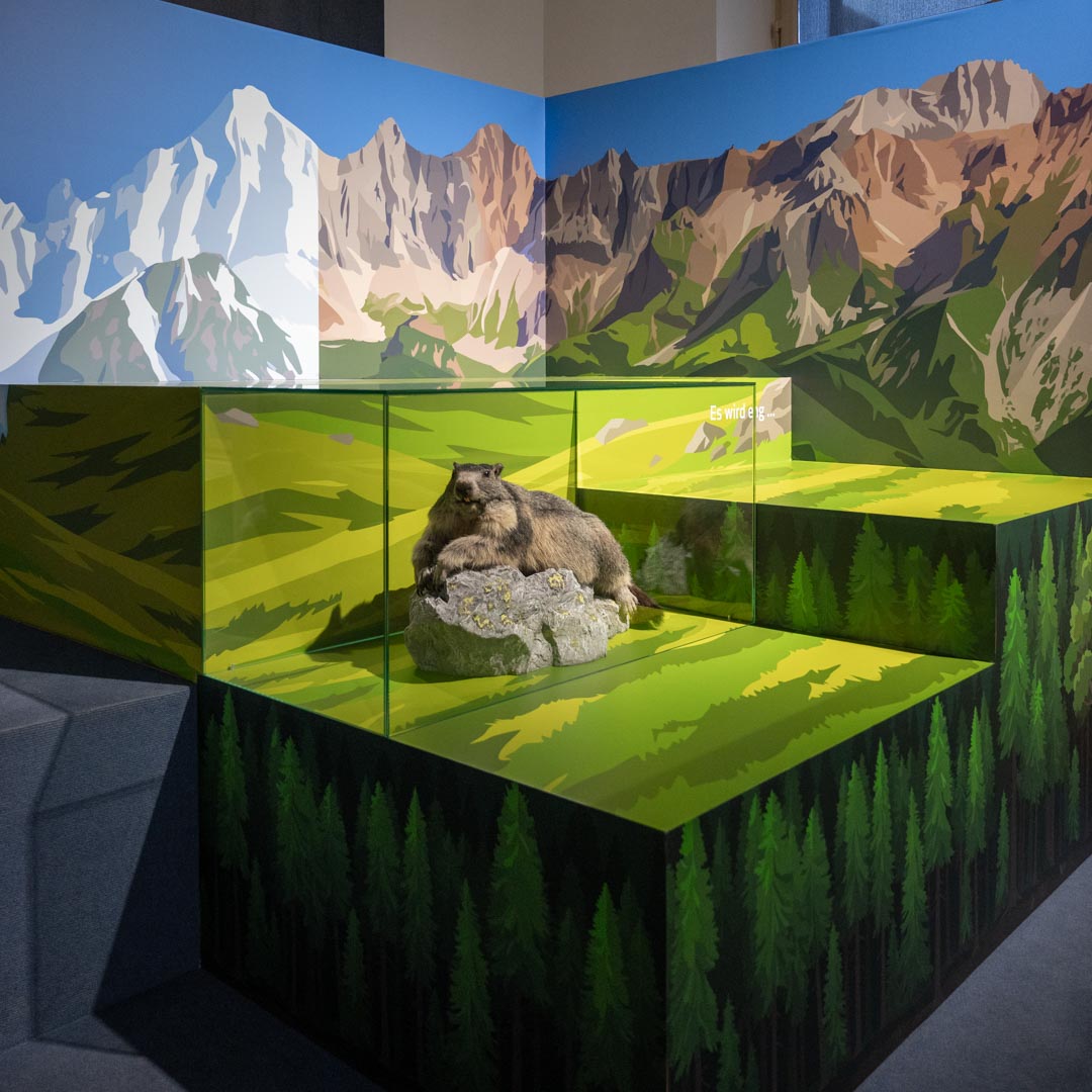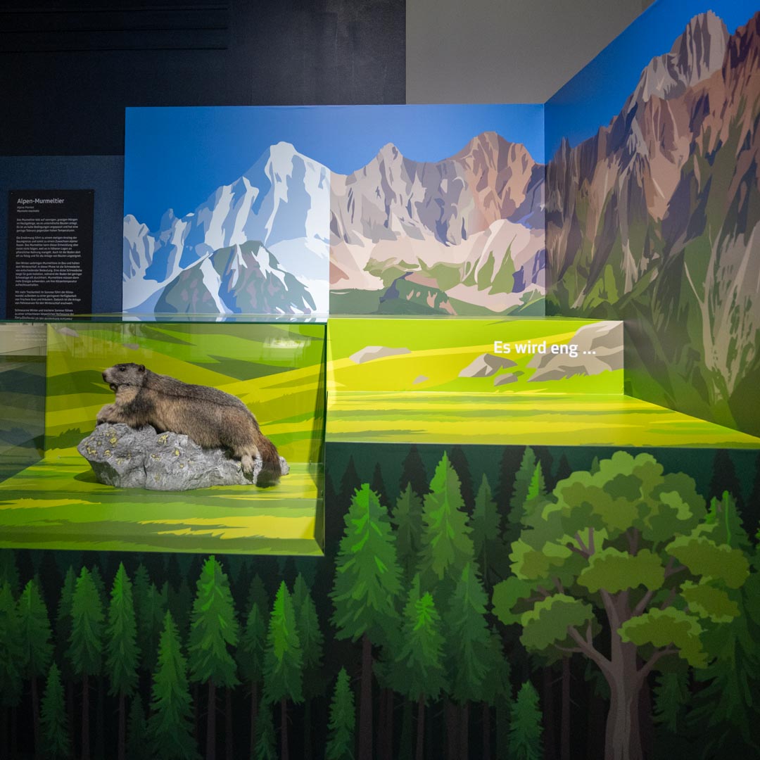 Zu sehen sind unter anderem ein Schneehase, der je nach Blickrichtung gut getarnt oder deutlich sichtbar ist, sowie ein Murmeltier, dessen Lebensraum durch das Vorrücken des Waldes immer kleiner wird.